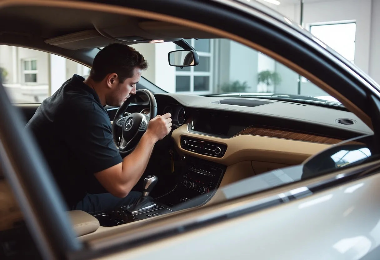 A technician applying a protectant to the dashboard and other interior surfaces of a car, ensuring long-lasting protection and shine.